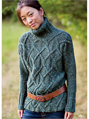 If you'd like an Aran knit that shows off your figure, this Aran off-shoulder pullover by Stitchlogue by Calista Yoo may be for you. I'd omit the crocheted flowers. This pattern is available for $7.00(USD).