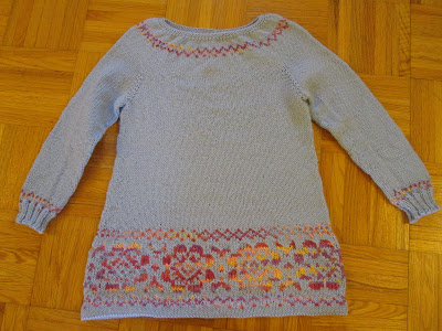 And here's the resulting sweater, in a size 8. This was a an exceptionally well-written pattern -- very detailed and clear and easy to follow. I'm pleased with my version of the sweater on the whole, though I do wish I could have gone with a paler blue for the main colour, as some of the stitch definition was lost because the blue of the silk roving and the blue of the Loyal were too similar. Other than that minor complaint, the colours proved to be an attractive combination that will look well on Cauliflower, who has fair skin, blue eyes, and light brown hair.